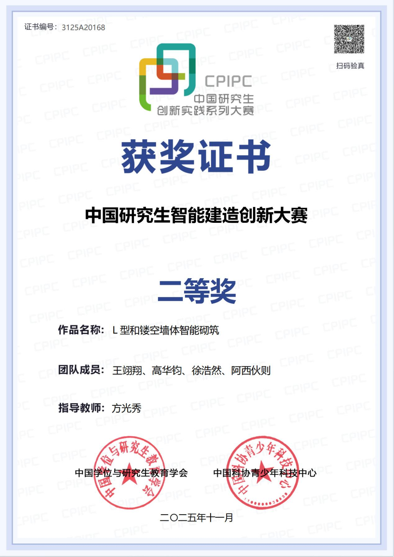 此次获奖不仅彰显了我校研究生在智能建造领域的创新实践能力与团队协作精神,也充分体现了我校土木水利学科在智能建造、BIM技术应用等方向的学科建设成效与人才培养质量。近年来,学校高度重视学科交叉融合与研究生创新能力培养,依托智能建造BIM实验室等平台,不断完善“理论教学+实践创新+学科竞赛”三位一体的培养模式,为研究生提供了广阔的学术探索与创新实践空间。学校将以此次赛事为契机,继续深化研究生教育教学改革,着力培养更多具备创新精神、实践能力与国际视野的高素质人才,为我国行业高质量发展与智能建造技术创新贡献延大力量。