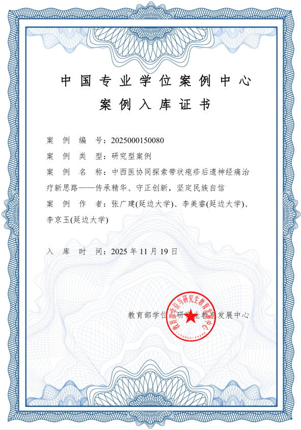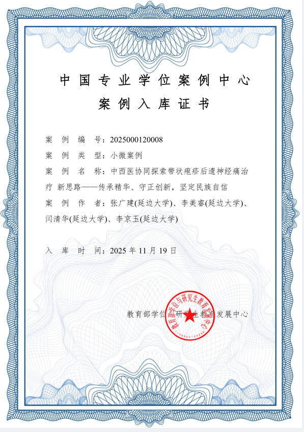 近日,我校附属医院疼痛科主任、研究生导师张广建教授带领团队完成的《中西医协同探索带状疱疹后遗神经痛治疗新思路》研究型案例和小微案例,成功入选中国专业学位案例中心案例库。这是我校临床医学学科在专业学位案例建设领域获得的首个国家级认可,标志着我校临床医学学科的科研水平与研究生培养质量均获得国家层面的充分肯定。